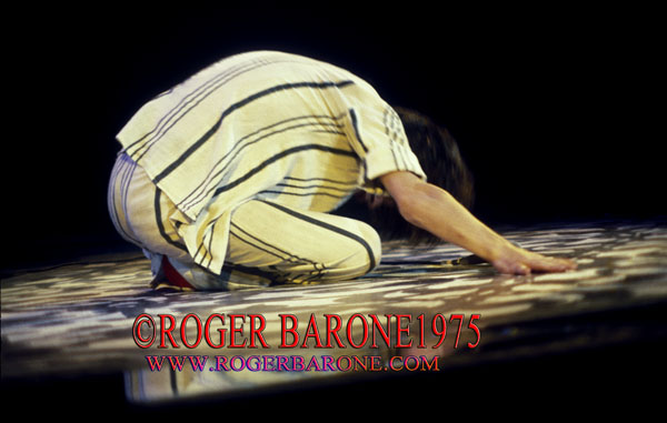 Mick Jagger crawls across the Rolling Stones' lotus leaf stage while performing "Midnight Rambler" at the Spectrum. © ROGER BARONE 1975
