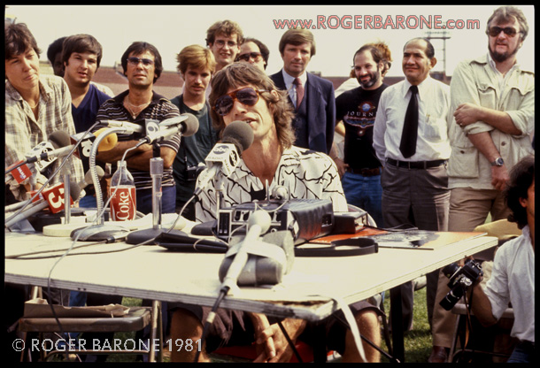 Mick Jagger announces the Rolling Stones' "Tattoo You" tour schedule at JFK Stadium. The press conference was originally planned at Independence Hall, but later moved to JFK. Jagger was accompanied by rock emprasario, Bill Graham. Paul Wasserman, the Stones' publicist is on the right; he died in 2007 (read obituary below). © ROGER BARONE 1981